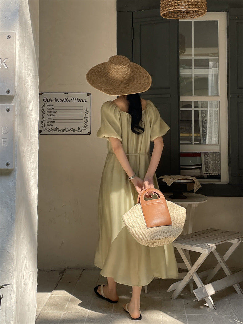 High Waist Square-Neck Puff Sleeve Midi Dress